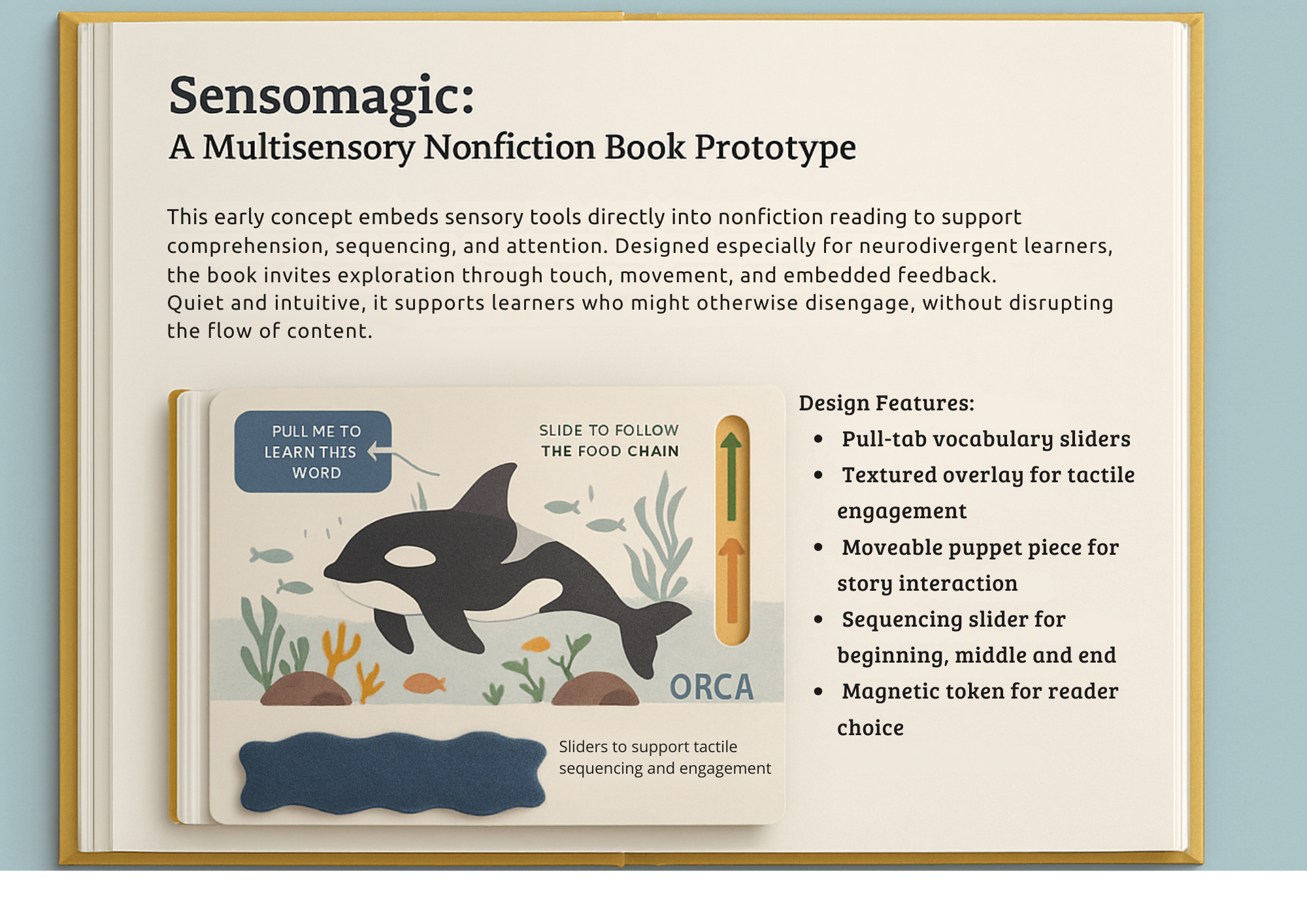 These prototypes embed simple fidgets like zippers, sliders, and poppers into literacy and learning tools.